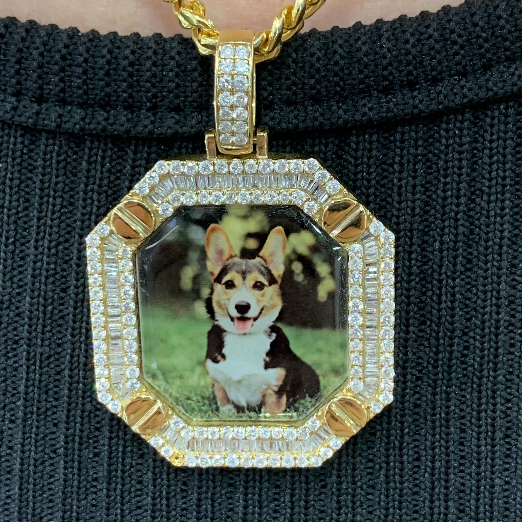 Yellow Gold and Diamond Memory Picture Pendant with Baguettes and Round Diamonds