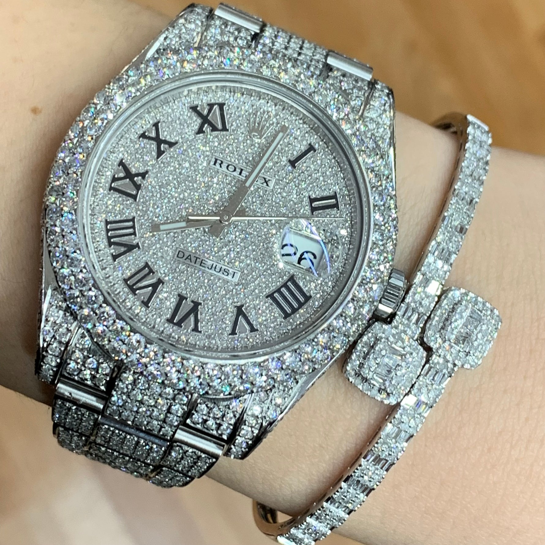 4 piece deal: 41mm Iced out Rolex Datejust 2 Oyster Band + White Gold and Diamond Twin Square Bracelet + White Gold and Diamond Flower Earrings + Gift from Marchello the Jeweler