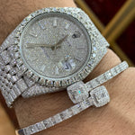 Pre-owned Iced out 41mm Rolex Datejust Watch with Stainless Steel Jubilee bracelet.