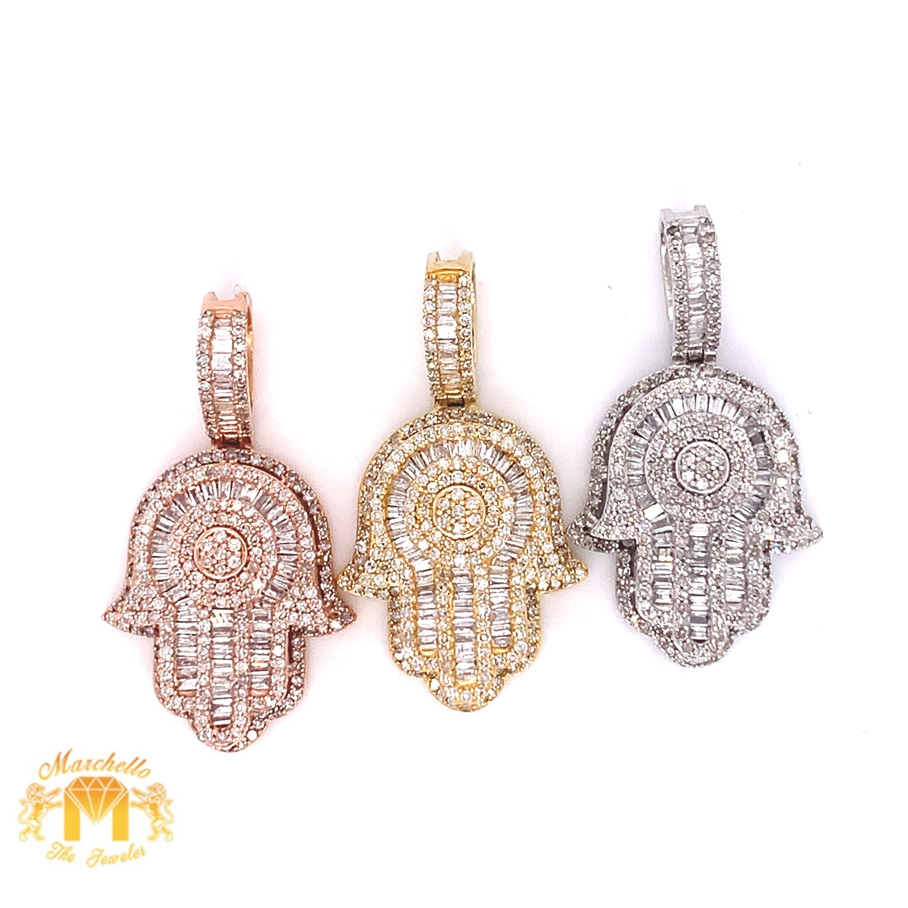 - 14k yellow, white or rose gold and natural baguette and round diamonds pendant.