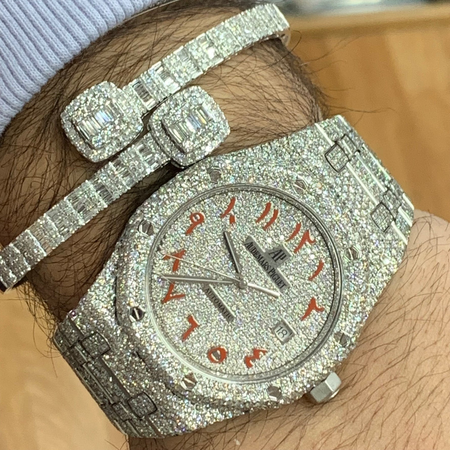 4 piece deal: 41mm Iced out Audemars Piguet AP Watch + White Gold and Diamond Twin Square Bracelet + White Gold and Diamond Flower Earrings + Gift from Marchello the Jeweler