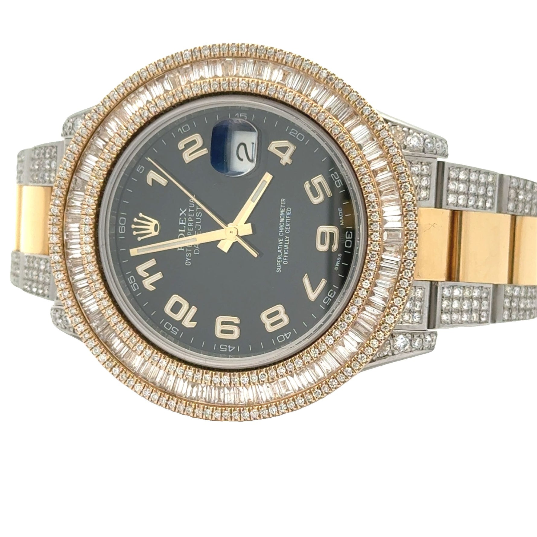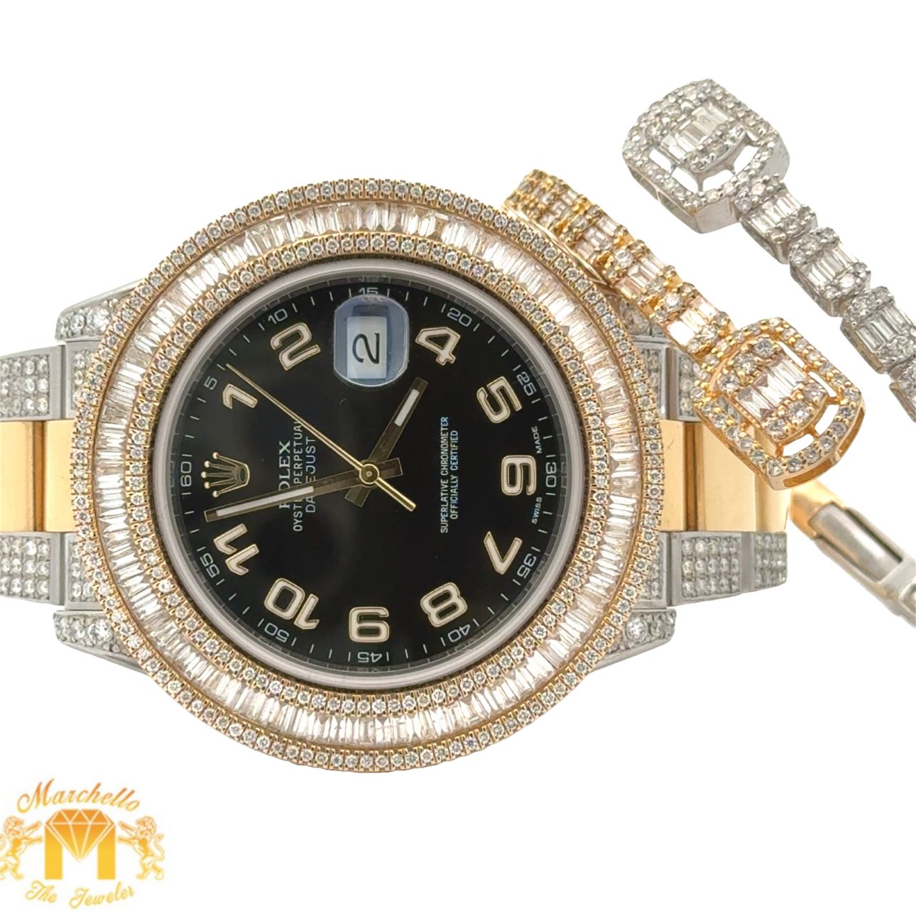 Disclaimer: Marchello the Jeweler Inc. is an independent seller of preowned Rolex watches and is not an authorized Rolex dealer. Addition of aftermarket diamonds voids Rolex warranty. Marchello the Jeweler Inc. is the sole warrantor of these watches for one year.