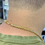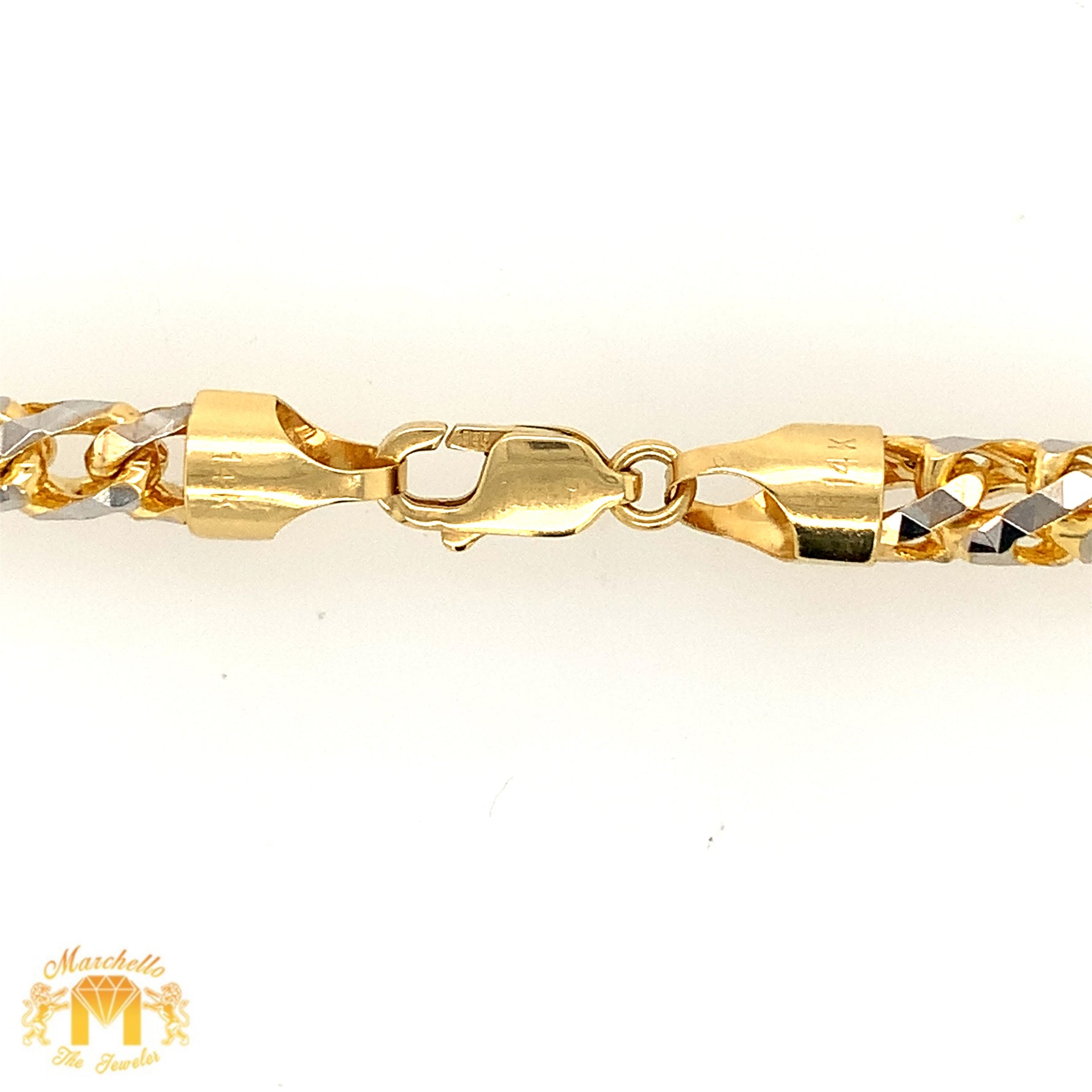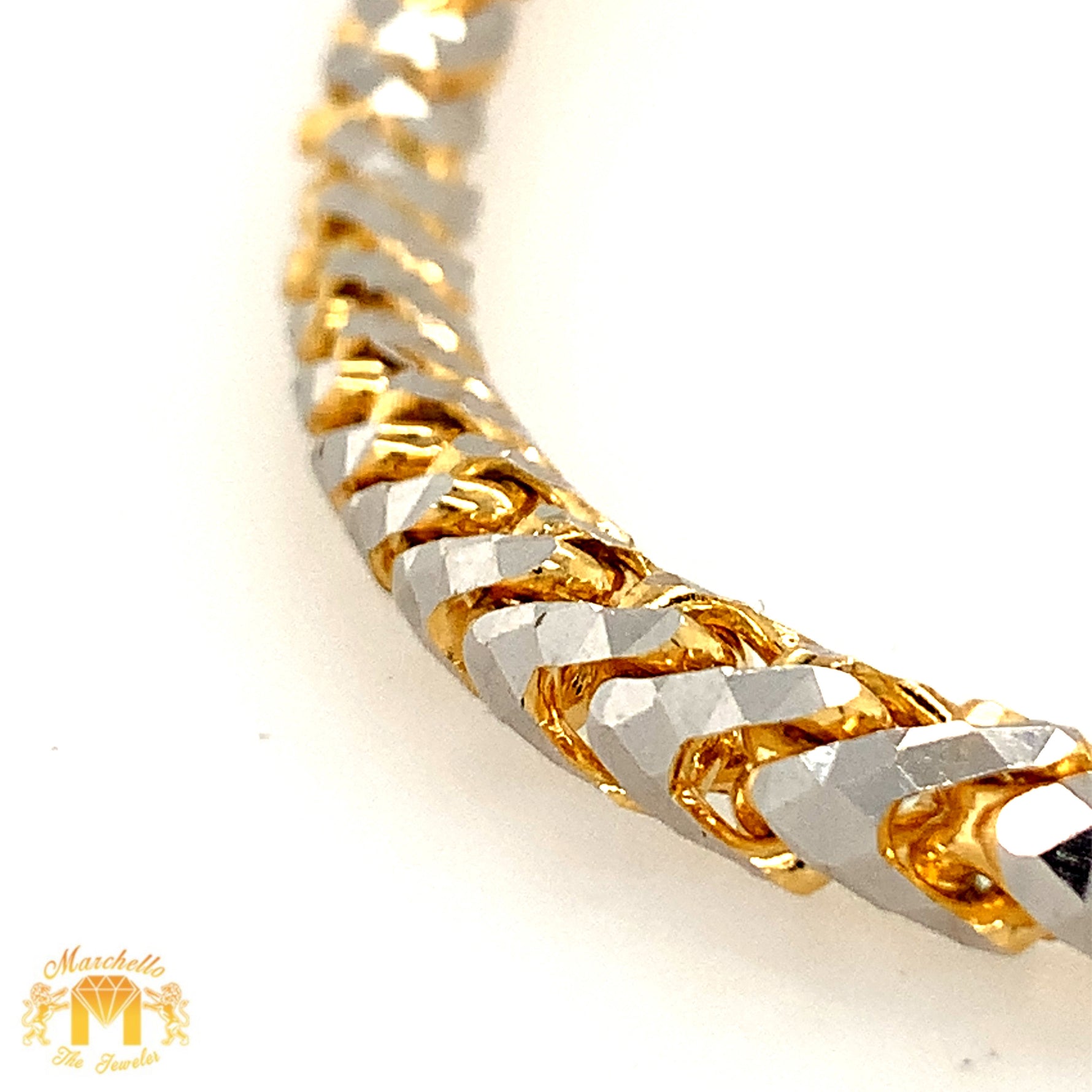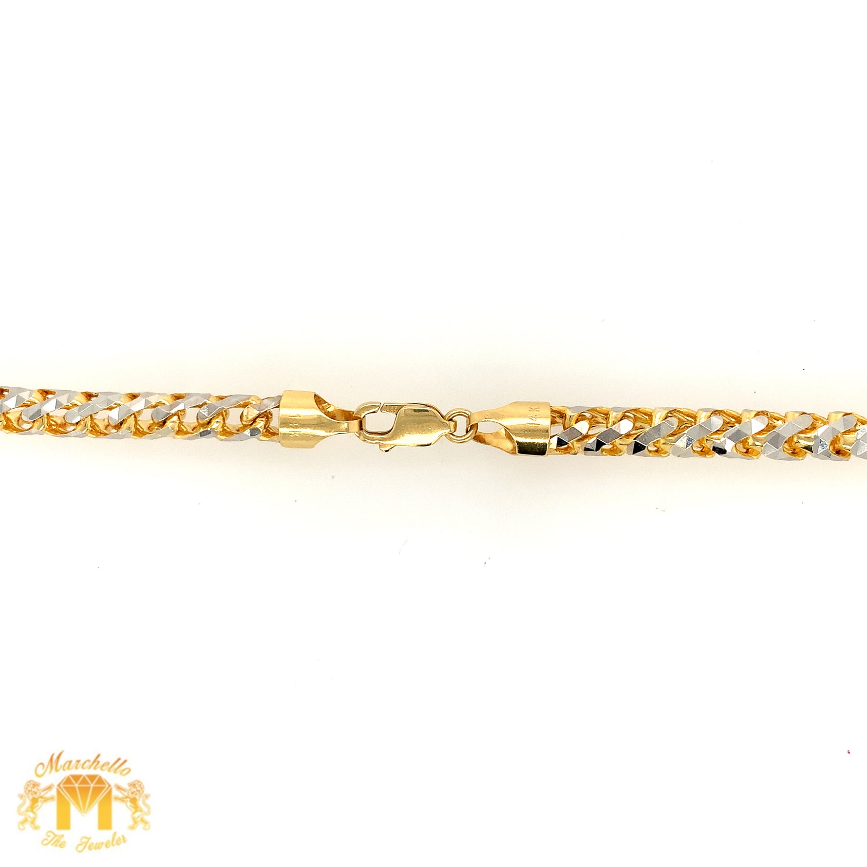 This bold yet elegant 6mm 14k Two-Tone Gold Solid Prism-Cut Franco Chain is solid and heavy, weighing 109 grams. Its prism-cut design makes it extra shiny and secure, giving it a luxurious appearance. The 24-inch chain includes a lobster claw clasp and comes with complimentary gold and diamond earrings and a surprise from Marchello.